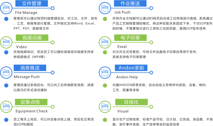 本系统是由南通精益电子有限公司自主研发,是面向生产现场执行指导的管理系统作业指导书SOP管理、生产图纸发放管理、安灯报警、消息群发等功能组成。 消除车间现场纸质流转,实现车间无纸化为目标。我们与各品牌ERP\MES系统积极整合,形成完整智能制造解决方案。
